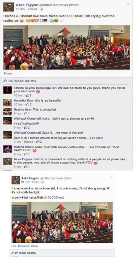 Reveling in their “victory” against the Jewish state, UC Davis student Senate member Azka Fayyaz, proclaimed on Facebook “Hamas & Sharia law have taken over UC Davis- Israel will fall Insha-Allah”.
